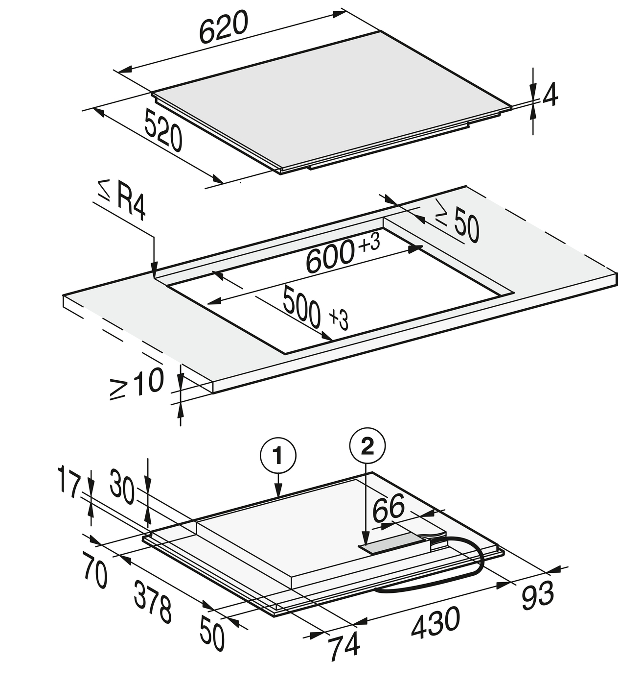 Внешние размеры выреза в мм (ширина) для встраивания заподлицо