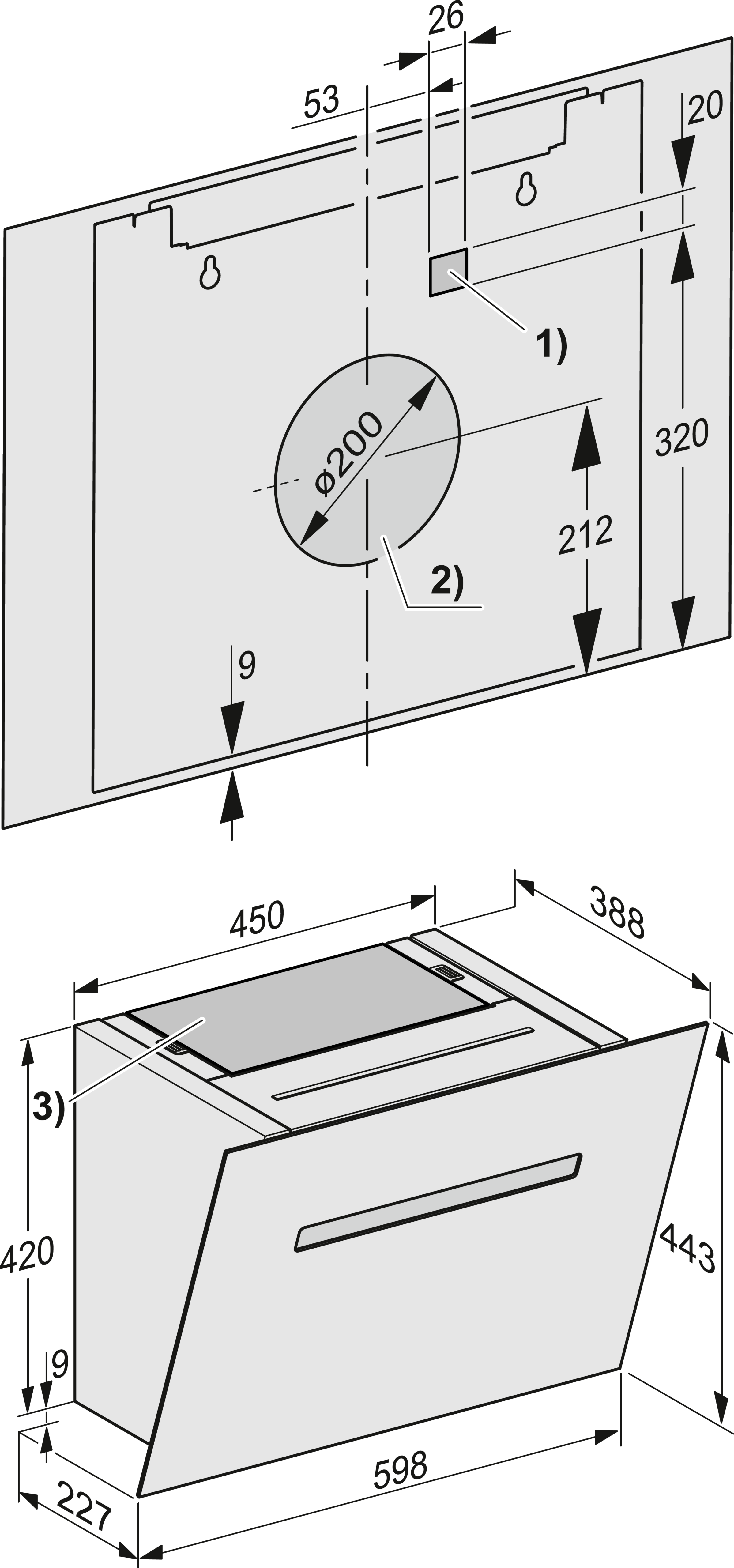 Общая высота вытяжки для режимов отвода воздуха и отвода с выносным вентилятором минимально (мм)