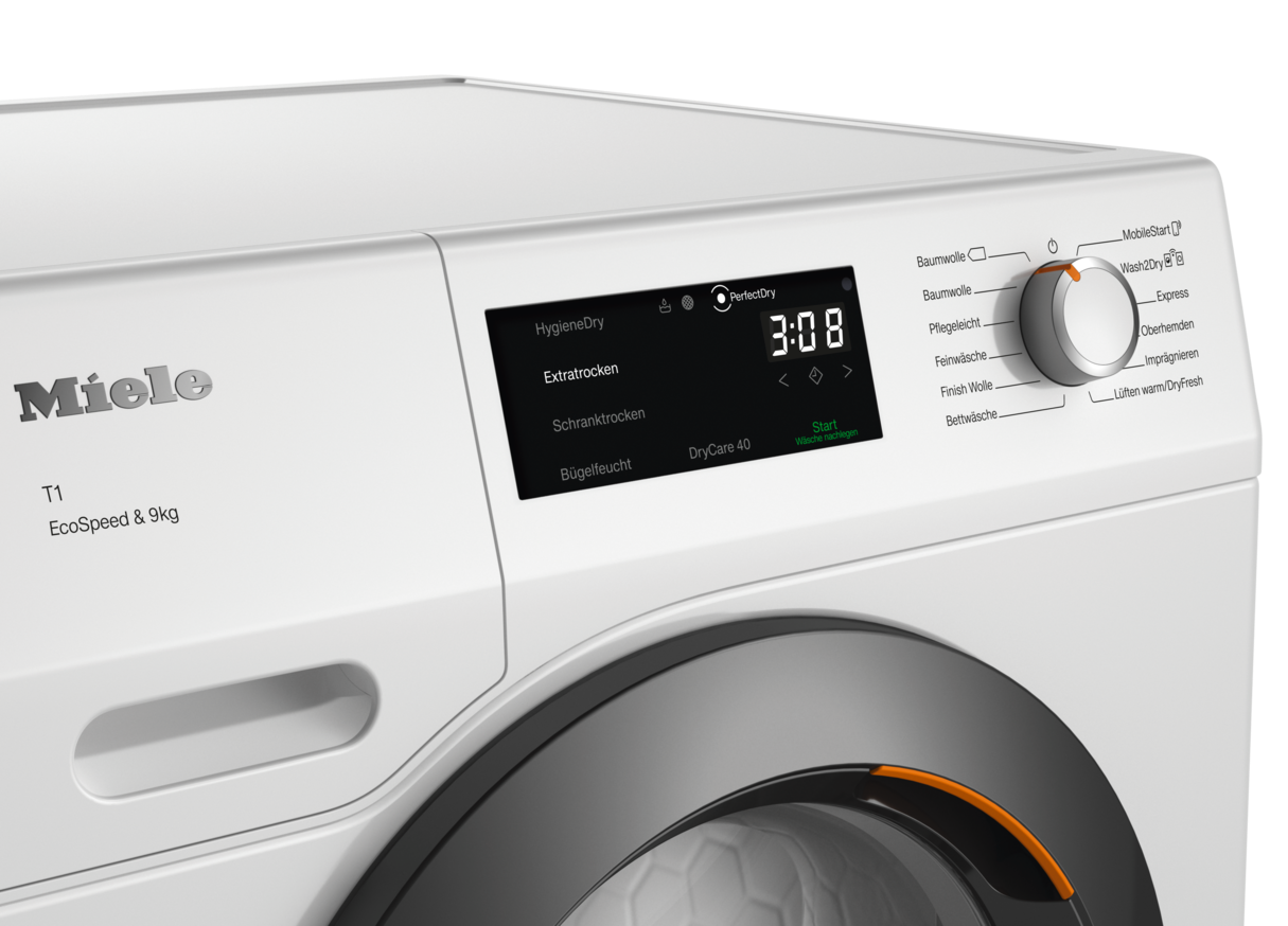 Сушильная машина с тепловым насосом T1: с DryCare 40 и SilenceDrum для тихой сушки с максимальным комфортом.